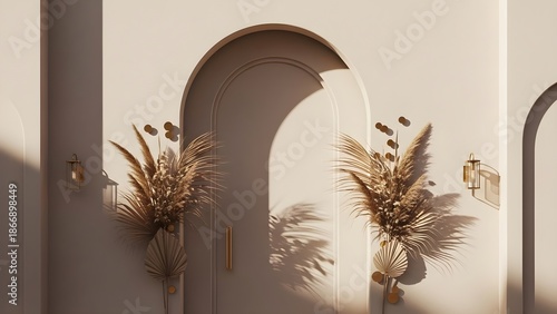 Elegant Ramadan decoration with dried flowers and architectural arches, creating a serene atmosphere