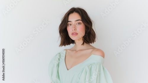 Elegant woman in mint green dress, soft bob hairstyle, natural makeup, minimalistic white background, relaxed and stylish fashion portrait, modern and feminine