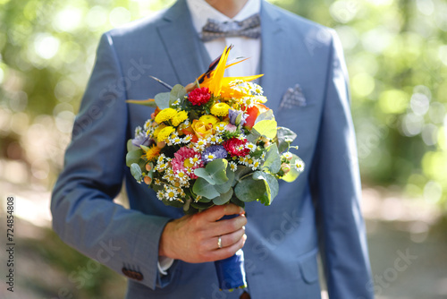 Eleganter Hochzeitsstrauß mit weißen und cremefarbenen Rosen in den Händen einer Braut