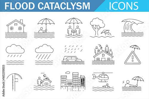 Emergency Response Icons: Flood Evacuation, Rescue, and Disaster Relief