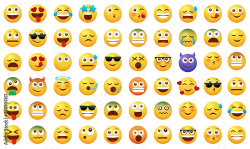 Emoticon smileys vector set. Emoji face icon smiley with smiling, kissing and sick facial expressions isolated in white background for cute emoticons cartoon collection design. Vector illustration