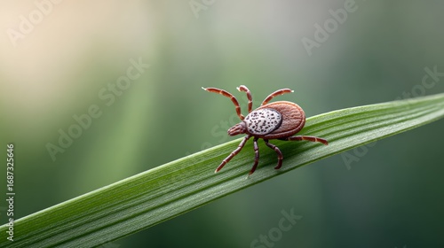 Encephalitis virus or lyme borreliosis disease infectious dermacentor tick insect crawling on green grass. Extreme close up macro of dangerous parasitic mite on plant leaf in garden or forest