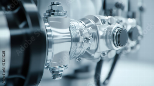 Engine component, The image showcases a detailed close-up of an industrial engine component. The sleek, metallic surfaces gleam, reflecting light and creating a sense of technological advancement.