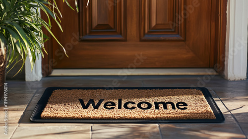entrance mat with the inscription Welcome in front of the wooden door