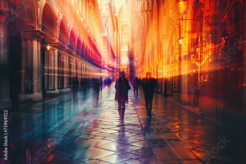 European city exploration and adventure,movement and the vibrancy of city life, contrasting elements like ancient architecture versus modern street art in a trendy blur style