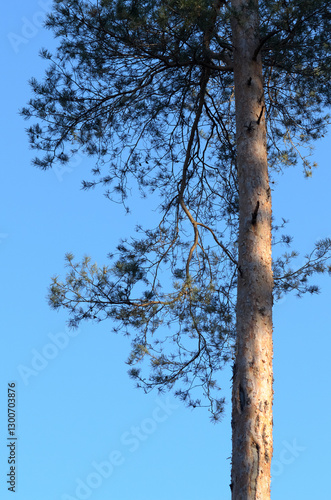 European Pine Pinus conifer tree in a forest against bright blue sky, natural woodland background