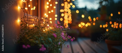 Evening patio flowers, fairy lights, bokeh. Cozy outdoor scene