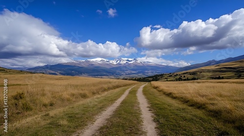Expansive Open Field with Dusty Path Leading Towards Majestic SnowCapped Mountains Under a Blue Sky : Generative AI