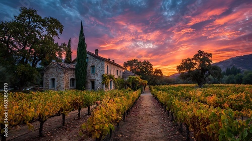 Expansive vineyard at golden hour with charming farmhouse and blank sky above, peaceful and organic agricultural countryside concept scene.