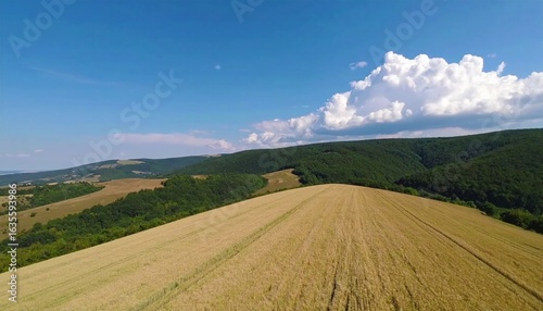 Expansive Wheat Field Under a Bright Blue Sky and White Clouds in a Rural Landscape
