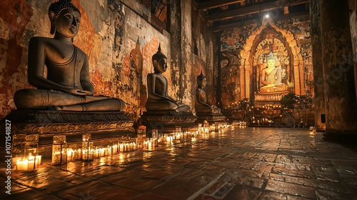 Explore the majestic interior of an ayutthaya temple featuring grand buddha statues and serene candlelit ambience