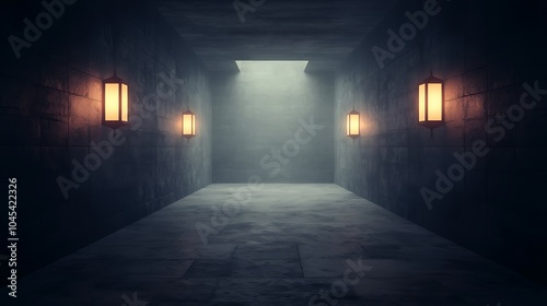 Exploring the mysterious depths of a dimly lit hallway with ambient lanterns evoking intrigue and solitude in a minimalist setting