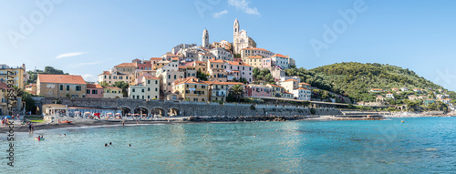 Extra wide panorama of the beach of Cervo with his beautiful historic center in background