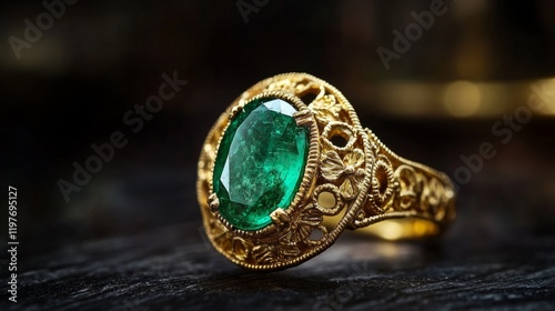 Eye-catching cocktail ring featuring a large oval emerald surrounded by intricate gold filigree generative ai