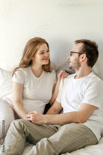 Family waiting for the baby. Husband and pregnant wife in a bright interior hug and smile. Pregnancy planning and preparation for childbirth