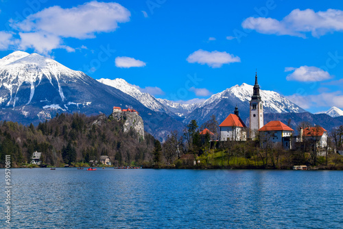 Famous alpine Bled lake (Blejsko jezero) in Slovenia, amazing autumn landscape. Scenic view of the lake, island with church, Bled castle, mountains and blue sky with clouds, outdoor travel background