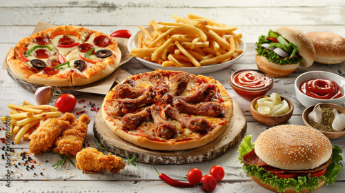 fast food items such as pizza, fried chicken, french fries, and a burger, arranged on a rustic white wooden table