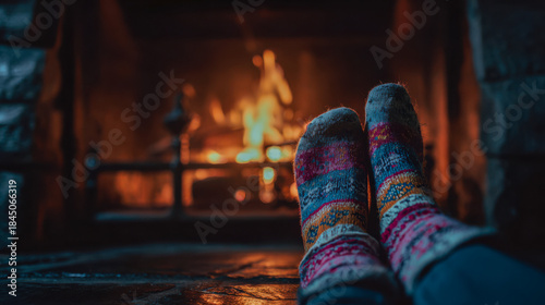Feet in cozy socks warming by fireplace fire