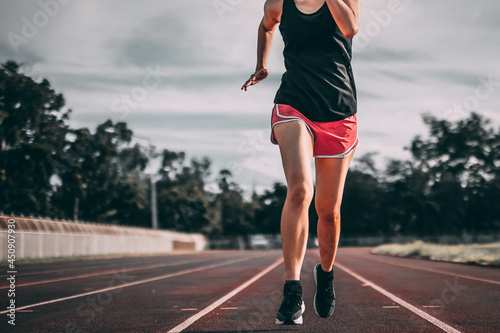 Feet of a female runner who is stepping on the running field with strength. Exercising in the summer with running methods to keep your body healthy.