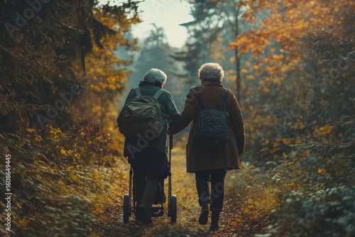 Female caregiver assisting senior woman with a walker on a walk in nature, fostering well-being and health for elderly individuals, Generative AI