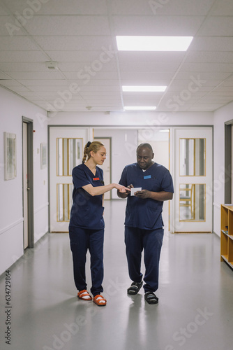 Female nurse discussing with male doctor while walking in corridor at healthcare center