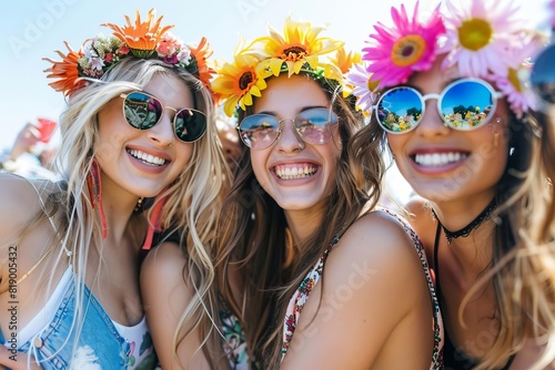 Festivalgoers wearing flower crowns and festival attire, laughing and posing for photos, lively environment, sunny day, isolated white background