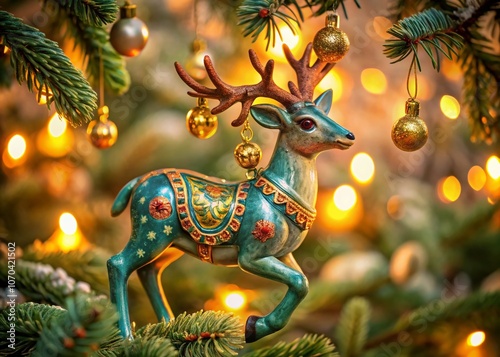 Festive ceramic reindeer Christmas tree ornament. A charming, hanging holiday decoration.