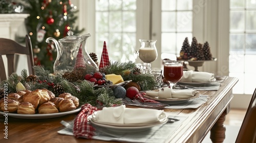 Festive Christmas morning breakfast table setting with pastries, drinks, and decorations.