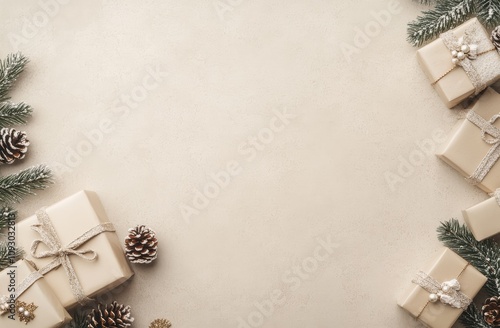 Festive gift arrangement with natural elements on a warm brown background