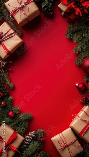 Festive red Christmas background with wrapped gifts and evergreen branches