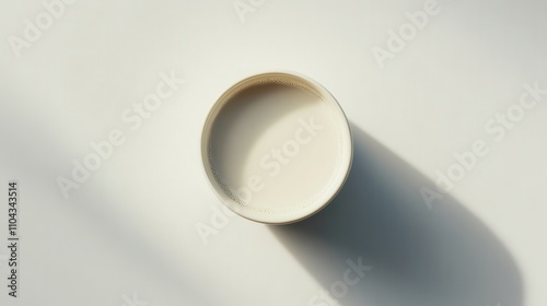 きれいな明るい背景に白いミルクカップを載せたミニマルな航空写真