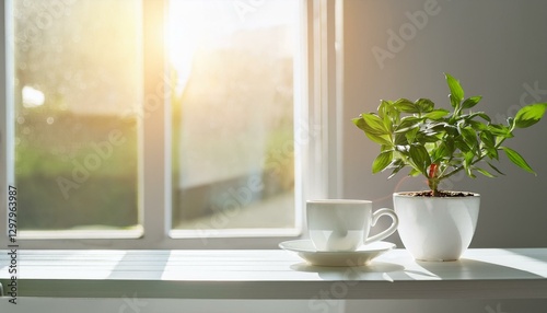 카페 창가, 테이블 위에 커피 한 잔과 작은 화분이 놓여 있는 조용한 분위기