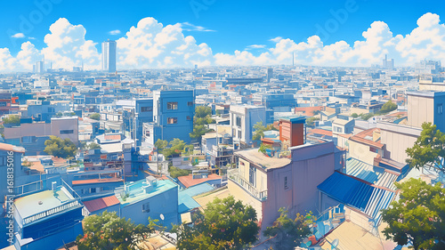 明るい青空の下、都市の広がりを丁寧に描写した手描きパノラマ風景。ノスタルジックかつ開放感に満ちた街並みを感じさせる、雰囲気あるイラスト背景素材