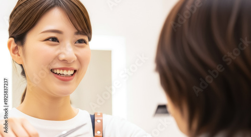 美容師がヘアサロンで女性客の髪をカットするシーン:ハサミを持つ手元とプロの技術