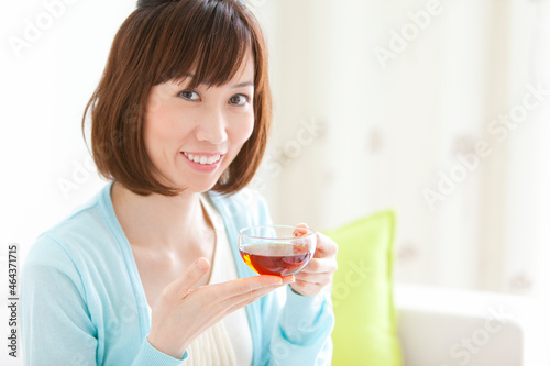 ティータイム中の笑顔の女性