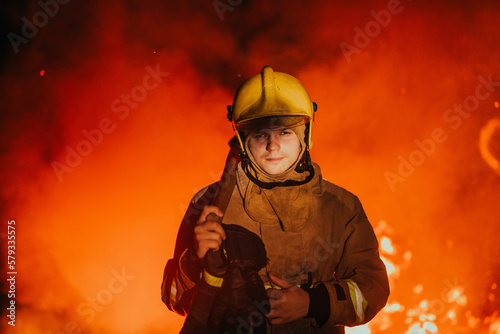 Firefighter at job. Firefighter in dangerous forest areas surrounded by strong fire. Concept of the work of the fire service