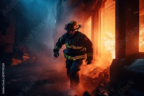 Firefighter in action. Generative AI.