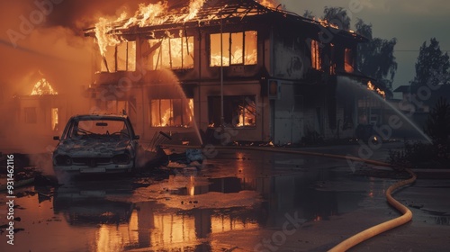 Firefighters battle an intense blaze consuming a building and a nearby car, the dramatic flames illuminating a scene of destruction and chaos.