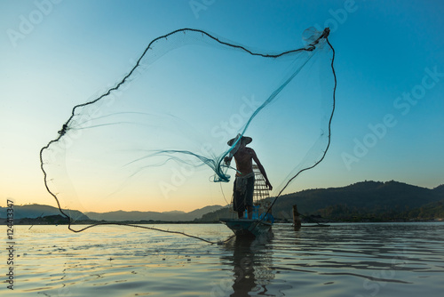 Fisherman casting his net at the sunset at Mae Klong River, Thailand