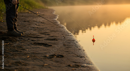 Fishing rod with bobber on lake shore at sunrise with copy space