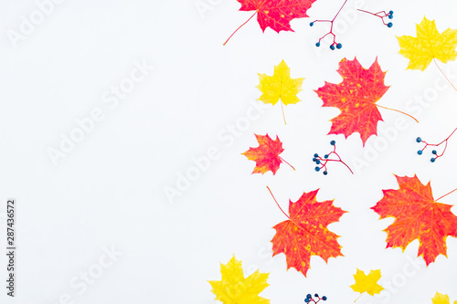 Flat lay border with colorful autumn leaves and berries on a white background