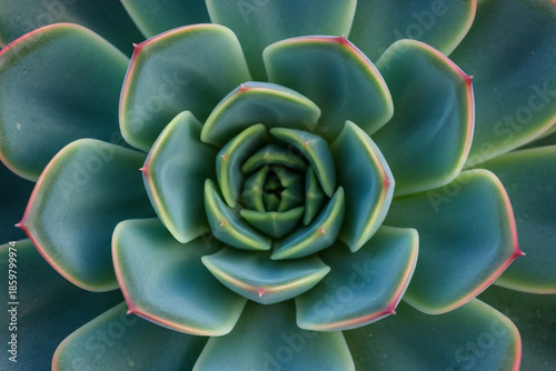 Flat lay of a succulent plant in blooming rosette pattern with green fleshy leaves and red edges. Banner template of botanical plant for gardening in mexican desert style.