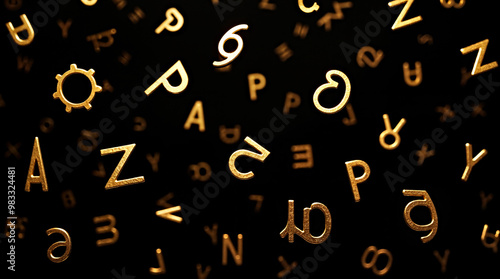 Floating Gold Letters and Runes on Black Background for Typography and Design Concepts