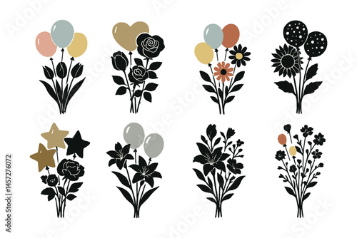 Floral and balloon icons set – celebratory bouquets, stars, roses, sunflowers, daisies. Vector icons set