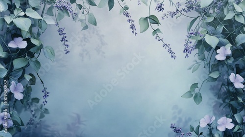 Floral frame with purple flowers and green leaves on a blue background.