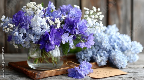 Floral Still Life: Blue and Purple Flowers in Glass Vase with Note