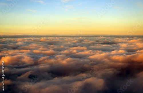 Flying above a sea of clouds in the evening sky