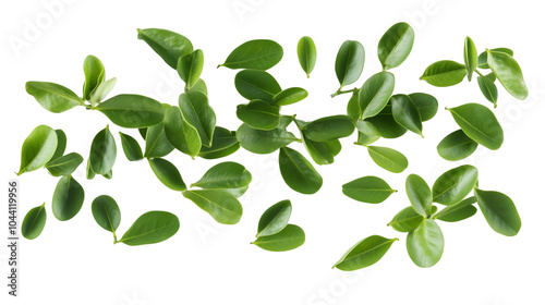 flying green leaves isolated on white background, fresh foliage scattered in motion for natural decorative design, botanical elements, cut out