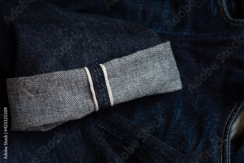fold hem of white selvedge japan dark blue jeans, vintage style denim.