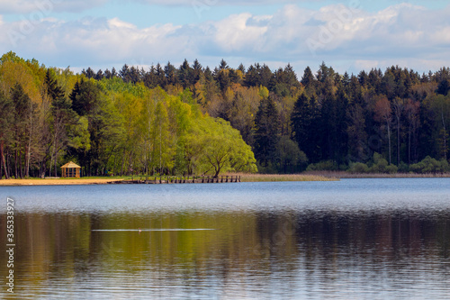 Forest landscape of the lake. The arbor is located on the shore. Spring forest, lake, coast, panorama. Reflection of nature in the water.